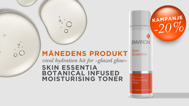 Månedens produkt er en viral «hydration hit». Et enkelt steg som gir umiddelbar fukt og en fresh “plump/glow”-finish. Perfekt nå når mange kunder opplever tørrhet, stram hud og en hudbarriere som trenger mer komfort. Toneren passer også ekstremt godt som «mellomsteg» for å få mer ut av hele Environ-rutinen, huden føles mer hydrert.